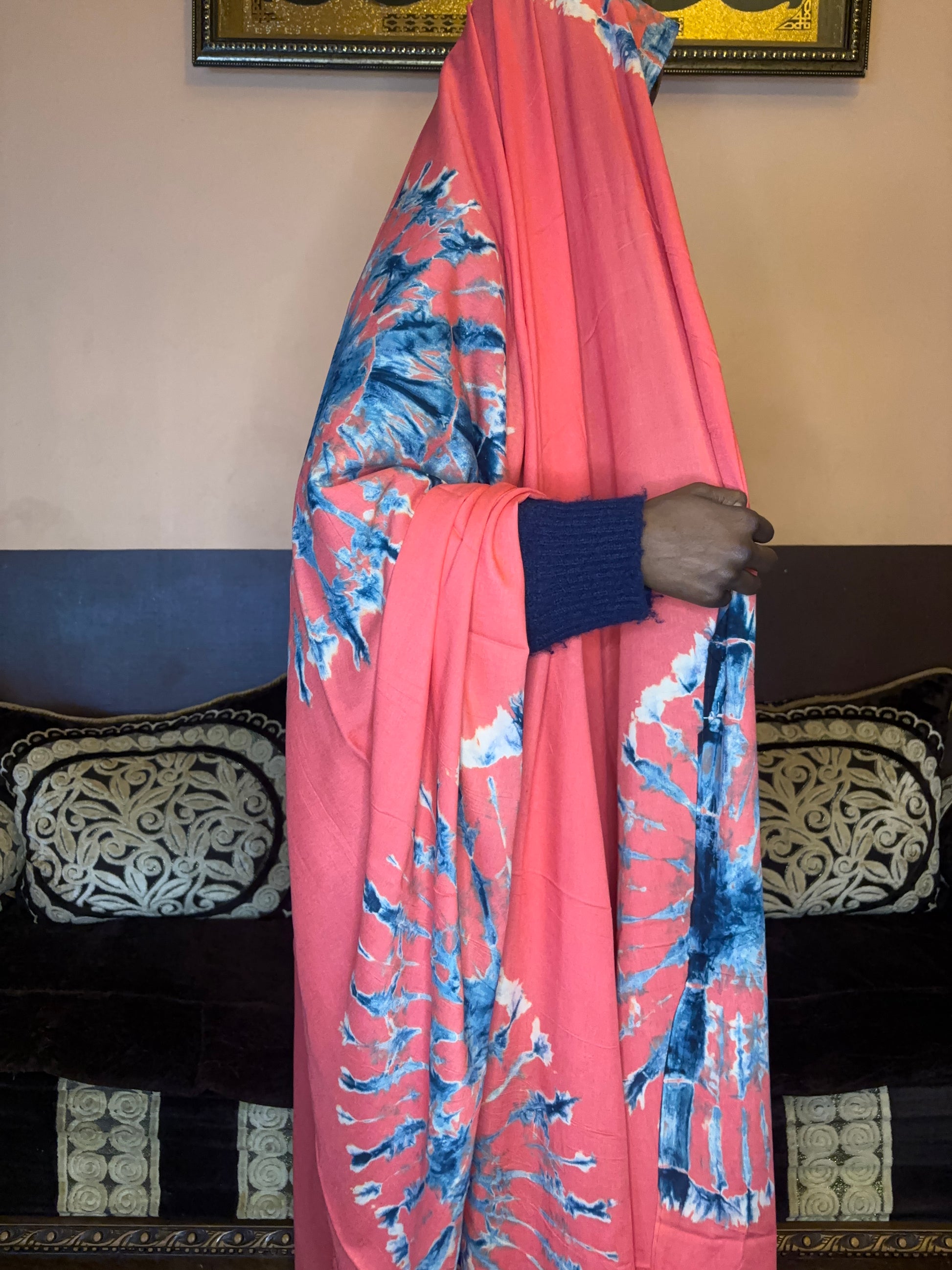 Melhfa d’un rose délicat qui se porte facilement lors de petites ou d’occasions spéciales.