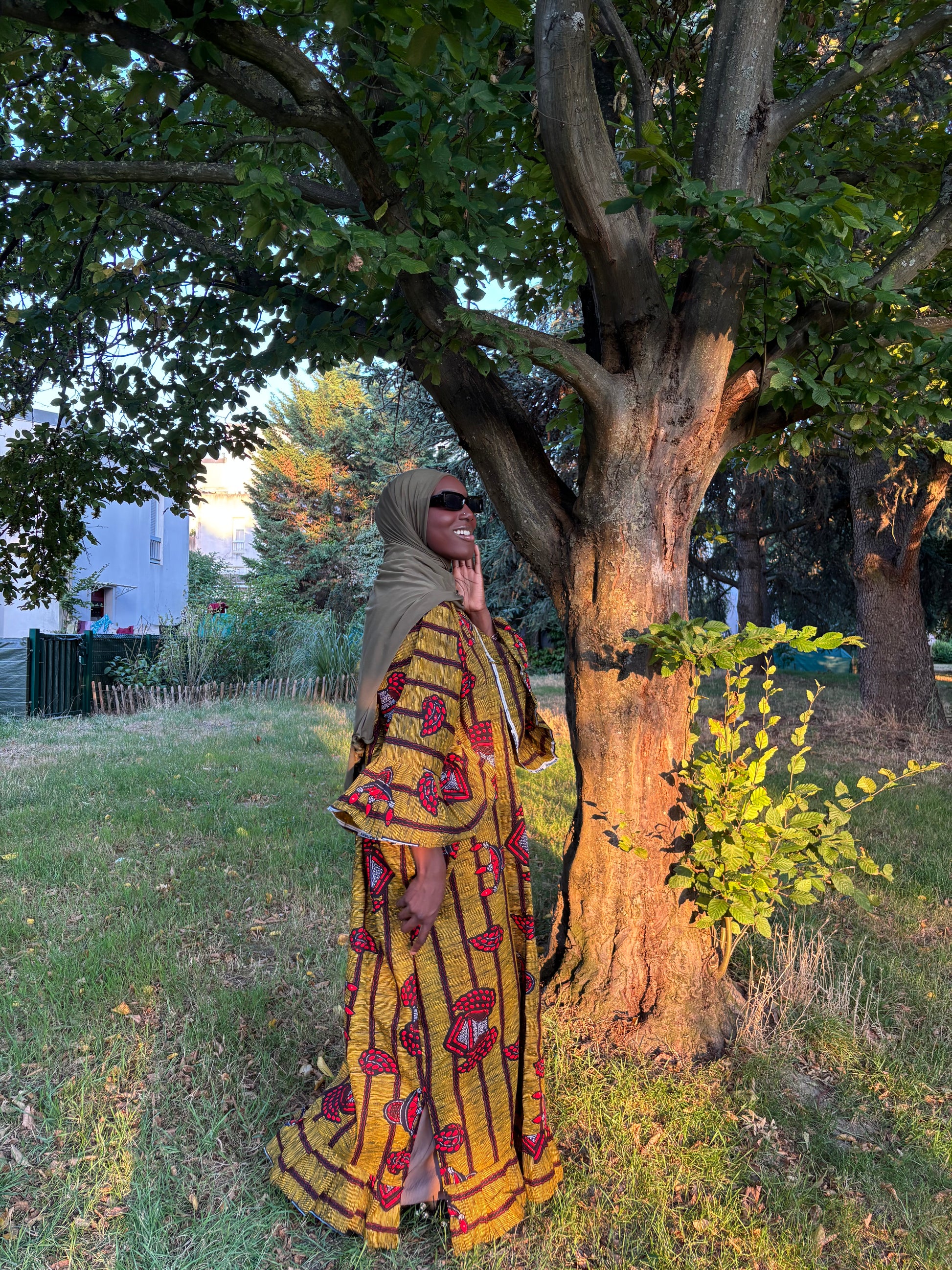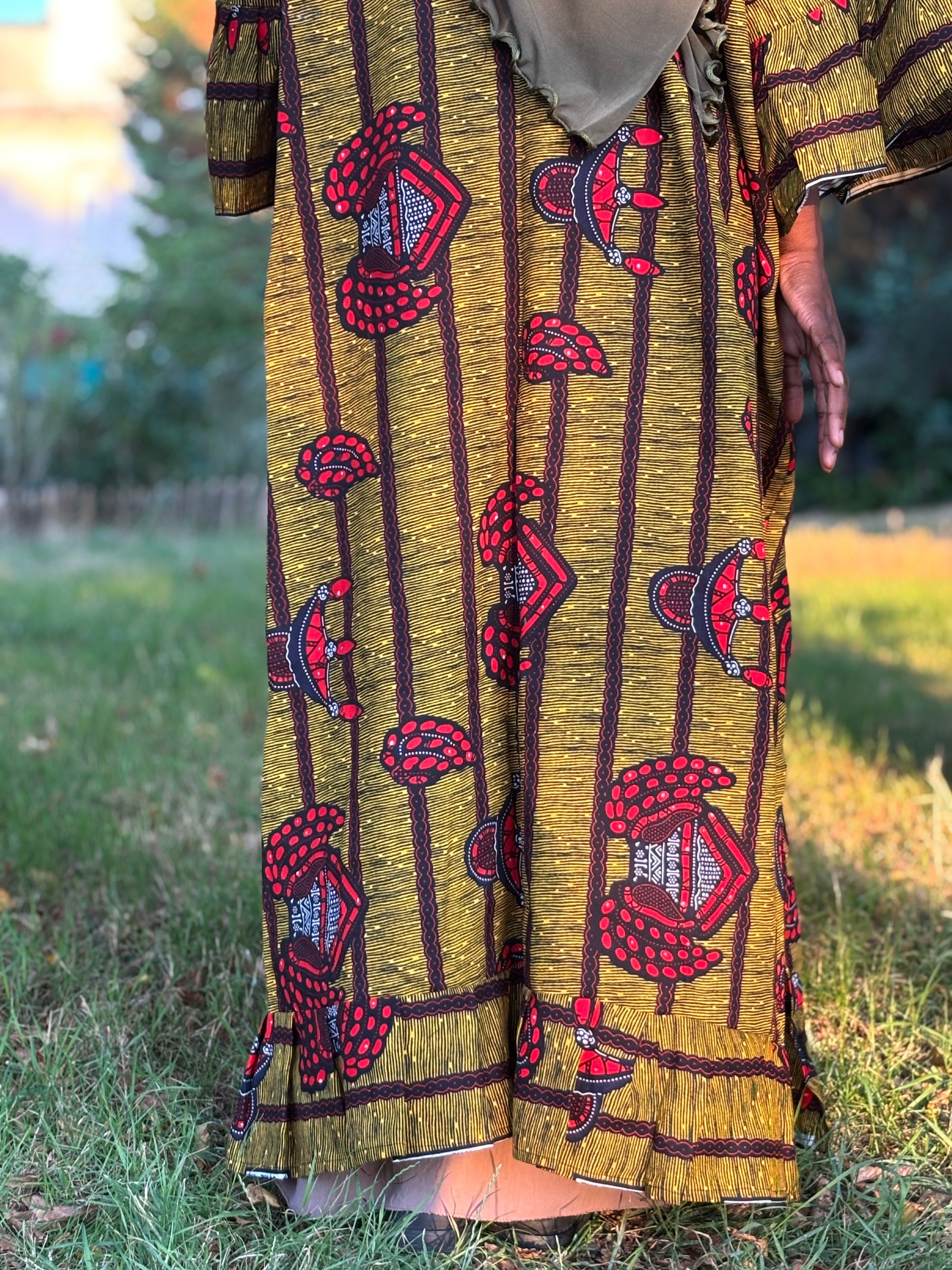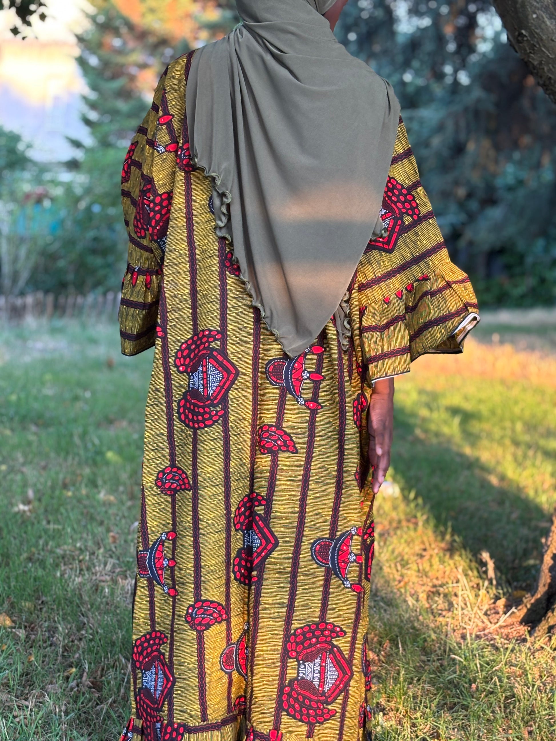Robe verte kaki rouge en wax disponible en 2 exemplaires manches à volants longues et 3/4.
