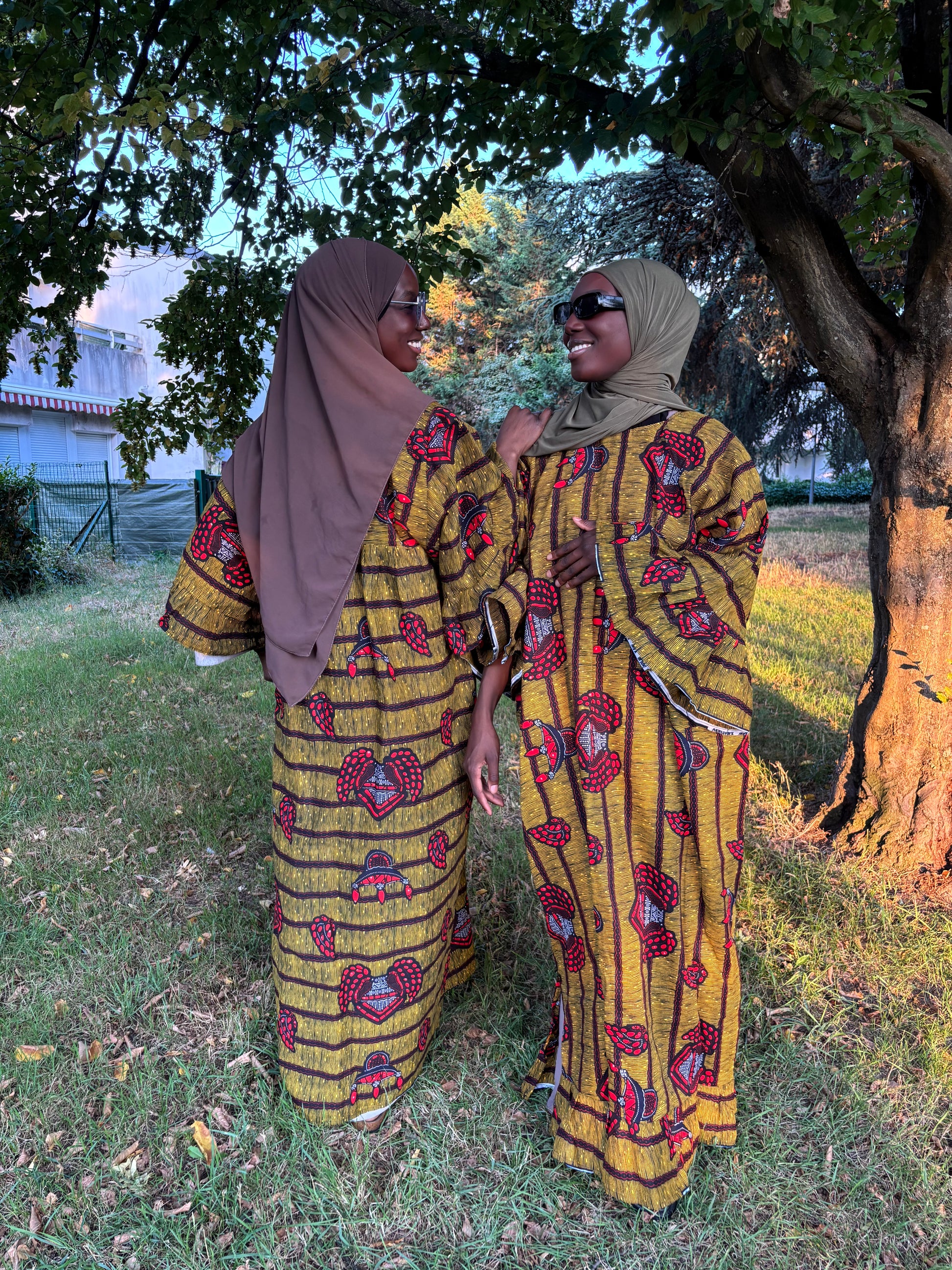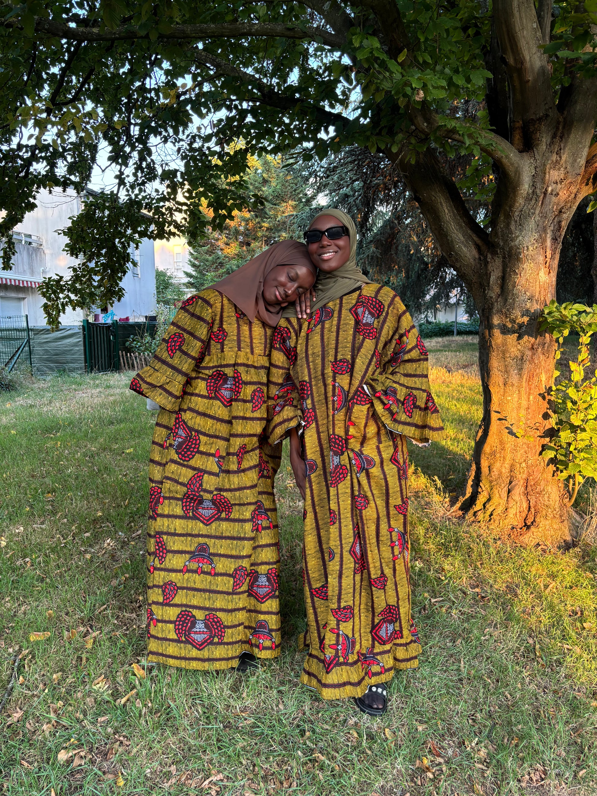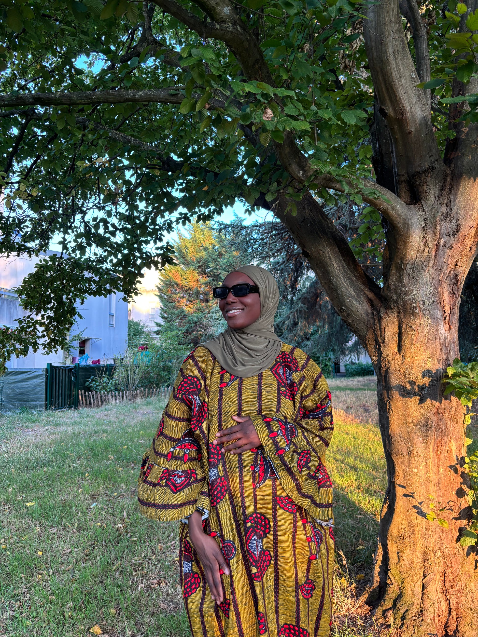 Robe verte kaki rouge en wax disponible en 2 exemplaires manches à volants longues et 3/4.